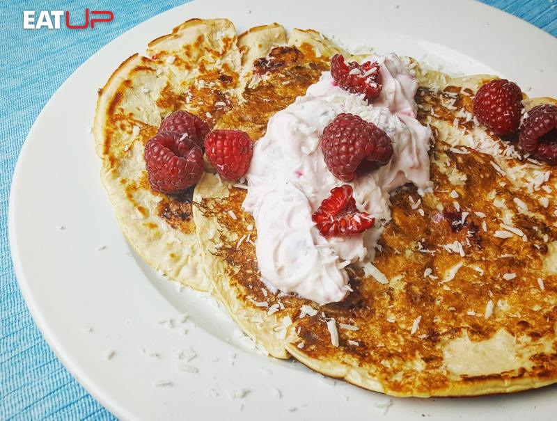 Gluten-free coconut and raspberry pancakes with ricotta cheese and Greek yoghurt for a creamy cheesecake flavour.