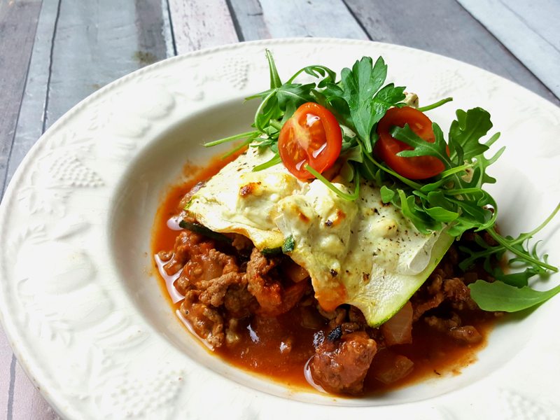 A simple lower carb beef lasagne using courgette slices as a pasta substitute, and a reduced fat bechamel style topping.