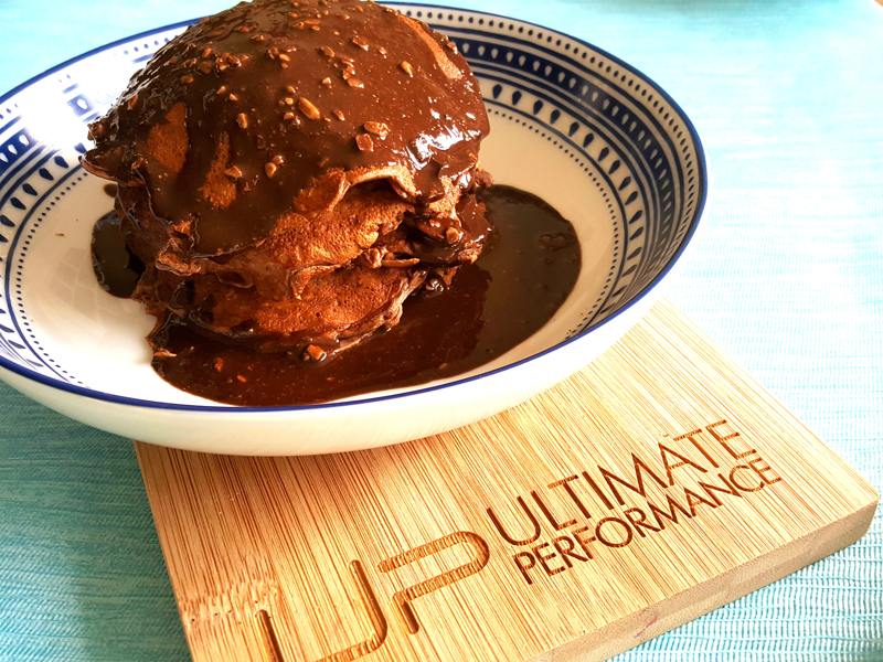 These chocolate and peanut butter pancakes are packed with protein and gluten free.