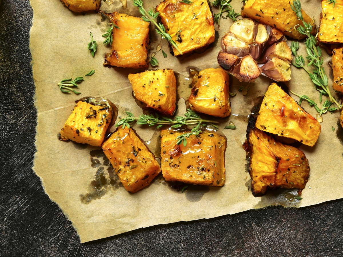 - Chop the red onion into thin slices then add the butternut, chestnuts and onion to the tray.